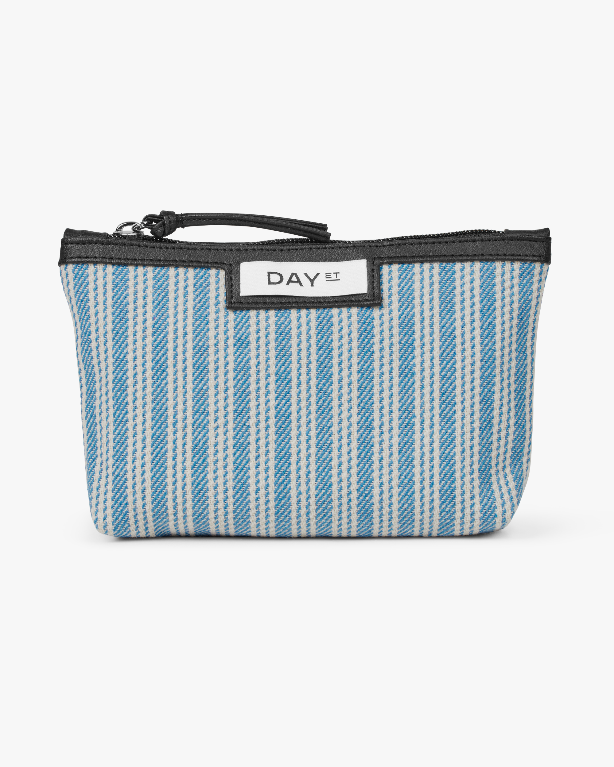 This mini is designed in a striped jacquard material, and it is closed with a zipper. It is perfect for storing your smaller items, and it keeps them collected.
