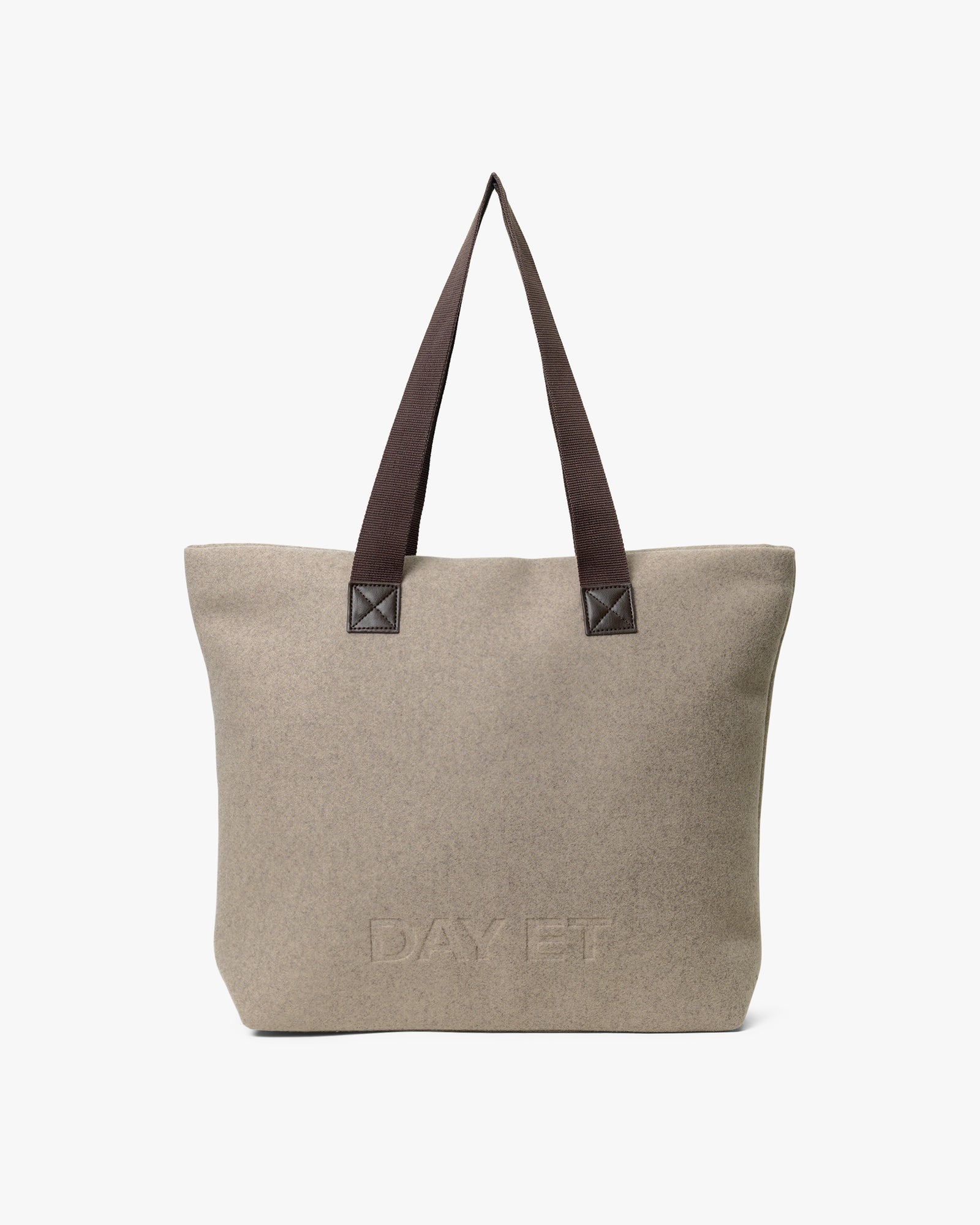 A roomy shopper crafted from soft wool material, featuring a recessed zip closure and long shoulder straps. Inside, you'll find a zip pocket for small essentials, helping you stay organised. A comfortable and practical choice for everyday use, with a warm and simple aesthetic.